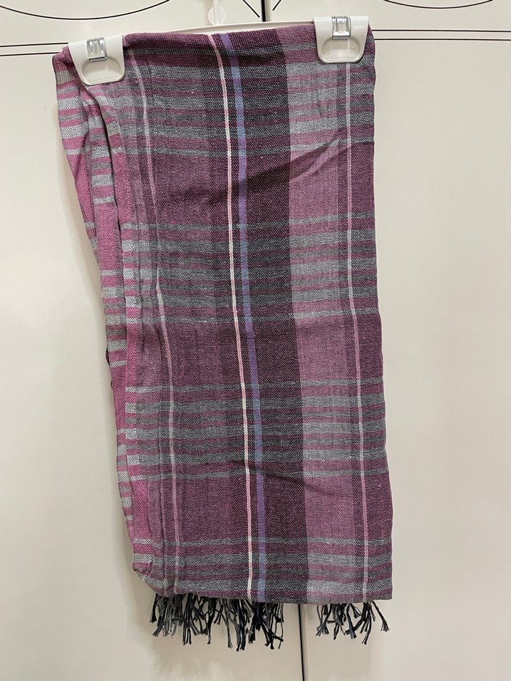 Kadınlar için koyu mor ekose desenli, pileli ve püsküllü kenarlara sahip şal. Yumuşak sentetik kumaştan, bohem ve rahat tarzlara uygundur. Marka temsilidir