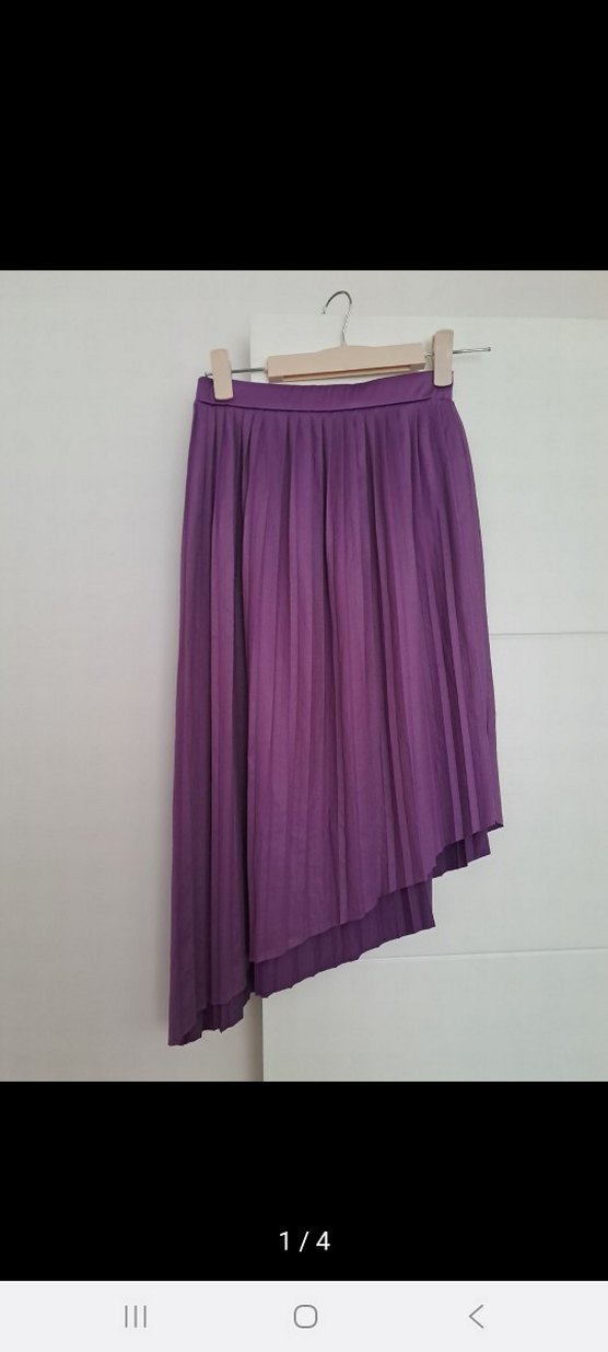 Mor renkte, pileli ve bol kesim uzun etek. Minimalist bohem tarzıyla günlük kullanıma uygundur.