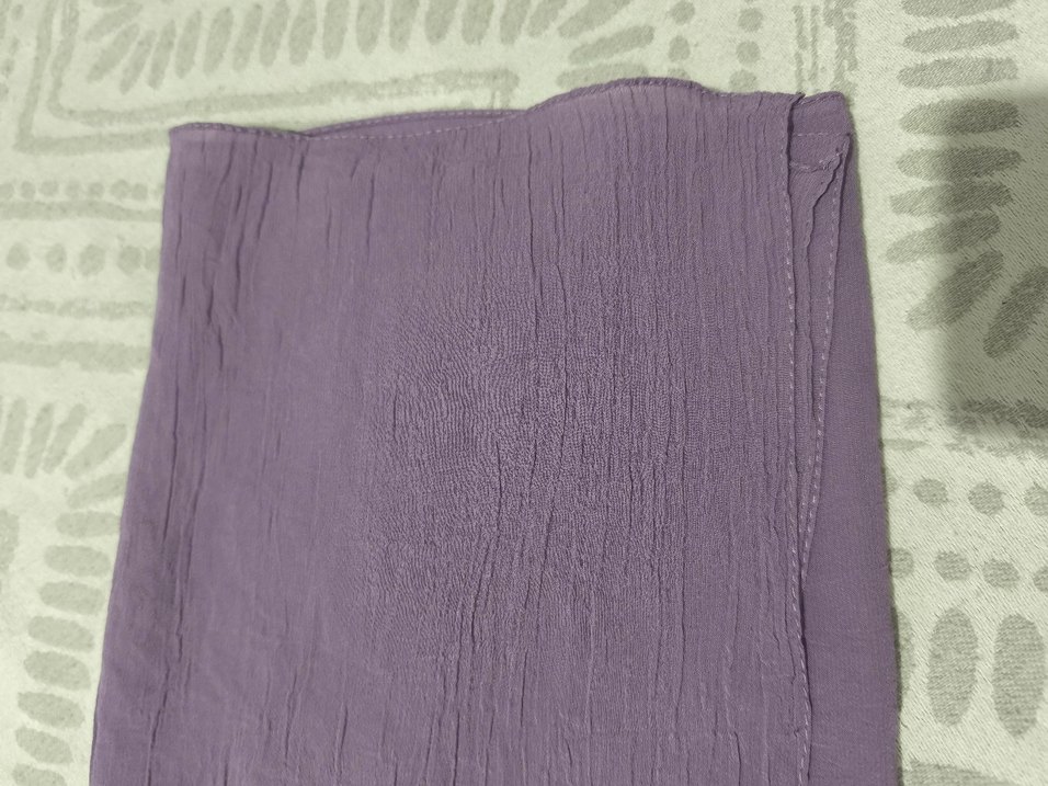 Yumuşak keten kumaştan, pilili dokulu, parlak mor renkte kadın şalı. Minimalist bohem tarzda.