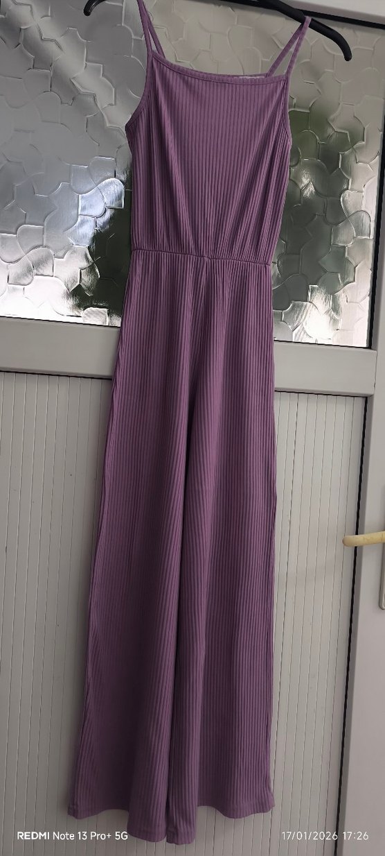 Mor renkli, pilili tasarıma sahip, askısız yakalı ve düz kesim kadın uzun tulumu, yumuşak sentetik kumaştan üretilmiştir. Günlük kullanım için uygundur.