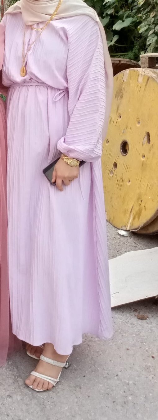 Pastel mor renkte, piliseli detaylı ve bol kesim kadın uzun elbise. İpek gibi kumaştan, uzun kollu ve straplez yakalı, minimalist bohem tarzda düğün için uygun.