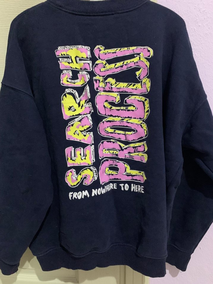 Mor renkli, uzun kollu, yuvarlak yakalı, bol kesim rock punk baskılı sweatshirt. Fermuarlı detaylı, günlük kullanıma uygun rahat model.