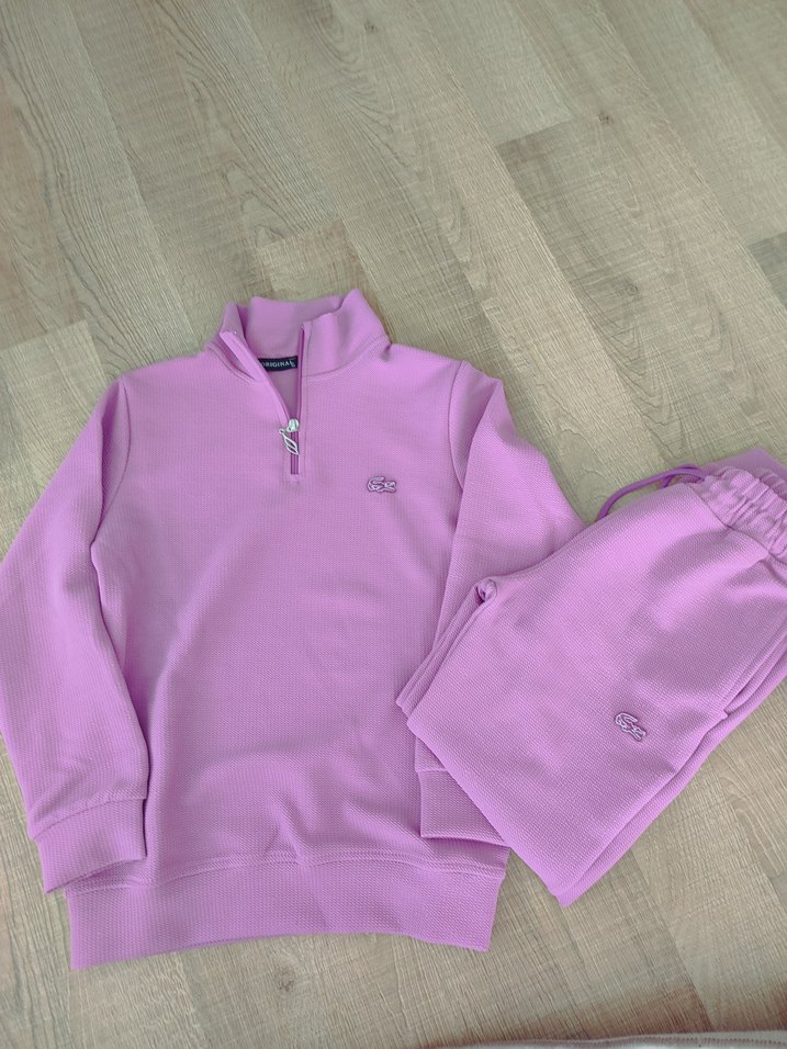 Kadınlar için salaş kesim, yuvarlak yaka ve uzun kollu eşofman takımı. Yumuşak ve sıcak kumaştan, pastel mor renkte, günlük rahat kullanım için şık ve rahat bir set.