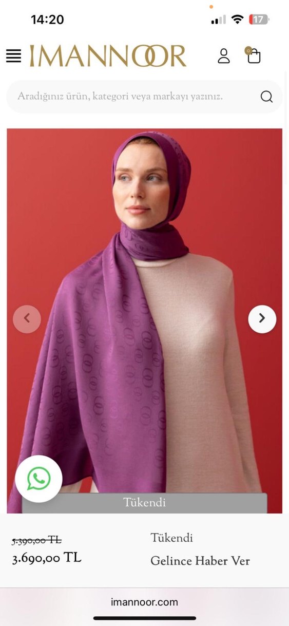 Kadınlar için parlak mor renkte, saten dokulu, dökümlü şal. Tükendi yazısı ürün üzerinde yer alıyor . İmannor