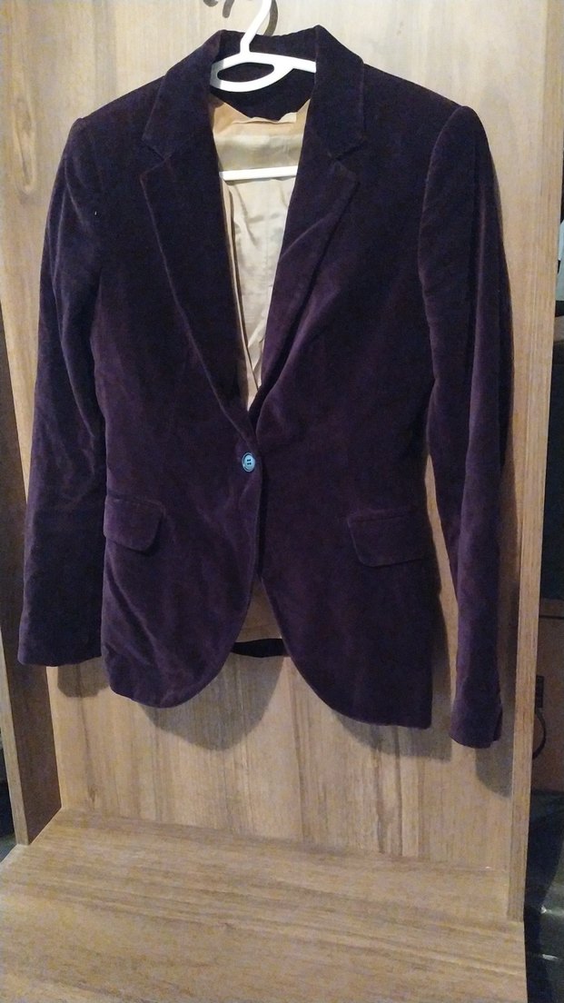 Mor süet kumaştan, düğmeli ve kesimli yakalı, uzun kollu, normal uzunlukta kadın blazer ceket. Ofis kullanımı için uygun, şık ve rahat bir model.