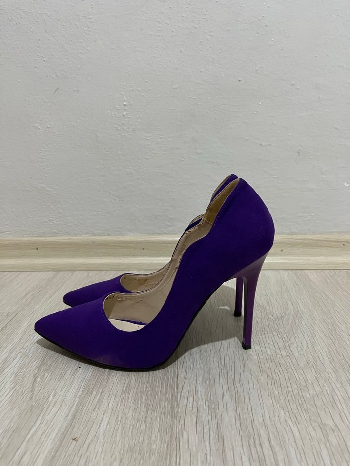 Mor süet stiletto topuklu ayakkabı, Romantik akşamlar için modern klasik tarzda