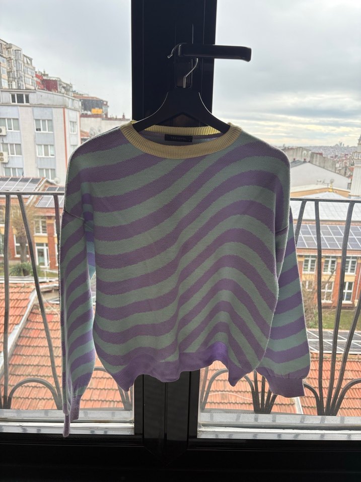 Kadınlar için uzun kollu ve bisiklet yaka, bol kesim triko kazak. Pastel mor tonlarda batik desenli, normal midi boyda yumuşak dokulu triko. Günlük kullanıma uygun sokak stili.