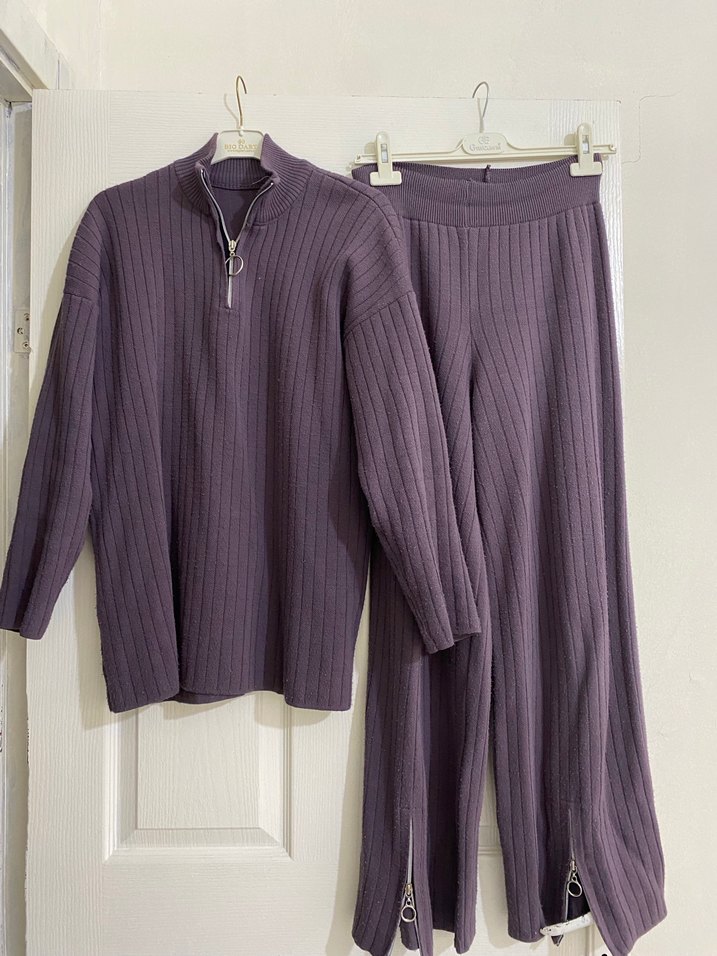 Kadınlar için mor renkli, yüksek yakalı ve uzun kollu triko takım. Bol kesimi ve fermuar detaylı pantolonu ile rahat ve şık bir görünüm sunar.