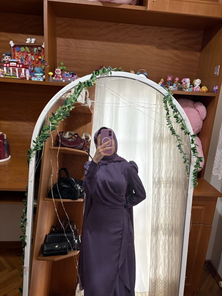 Yüksek yakalı, uzun kollu, mor renkli, drapeli ve saten dokulu kadın uzun elbise, sade ve şık bir duruş sunar. 48 kiloya kadar olur herhangi bir terzi işlemi görmemiştir şal için artı 150 tl fiyat koyuyorum şalı istemediğiniz taktirde belirtmeyi unutmayın lütfen iyi günler:)
