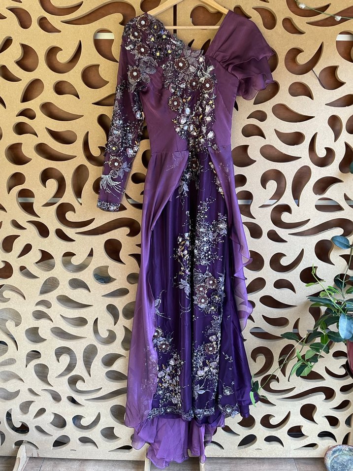 Kadın mor uzun elbise, drapeli detaylara ve desenli tasarıma sahiptir. Tek kol uzun kollu ve straplez yakalıdır, salaş kesimlidir.