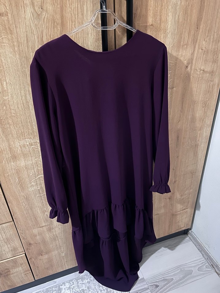 Kadın mor renk uzun kollu, yuvarlak yakalı, bol kesim tunik. Etek ve kol uçlarında fırfır detayları bulunur, yumuşak sentetik kumaştan üretilmiştir.