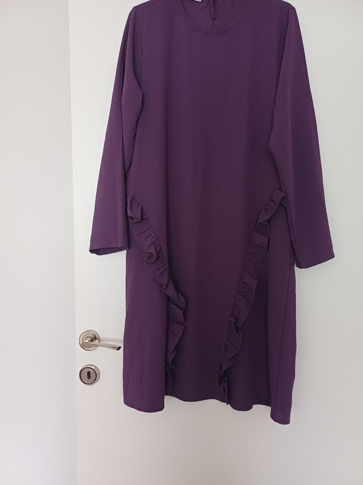 Uzun kollu, yüksek yakalı mor tunik, ön kısmında fırfır detaylara sahiptir. Salaş kesim ve sade, mütevazı tarzıyla günlük kullanıma uygundur.