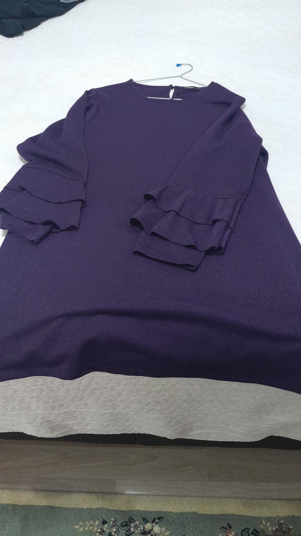 Mor renkli, uzun kollu ve fırfırlı detaylı salaş kesim tunik. Yumuşak sentetik kumaştan, yuvarlak yakalı ve midi boyda, rahat günlük kullanım için uygundur.