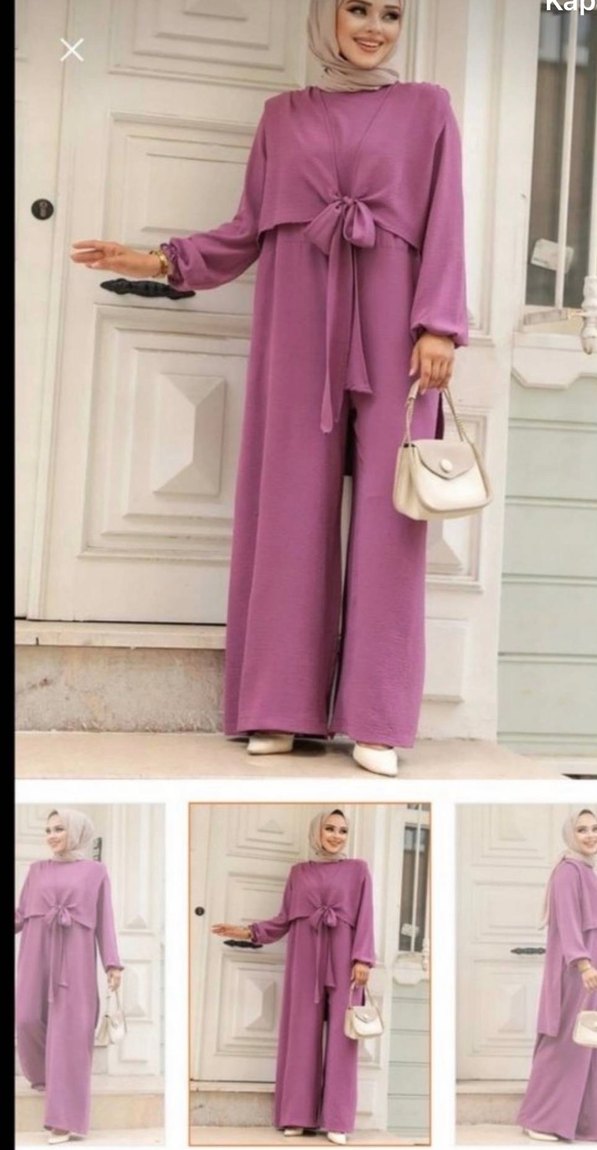 Mor uzun kollu kadın takımı, kuşaklı ve yakası kesik detaylı. İpeksi kumaştan, günlük kullanım için uygun, rahat kesim ve trend görünümlü.