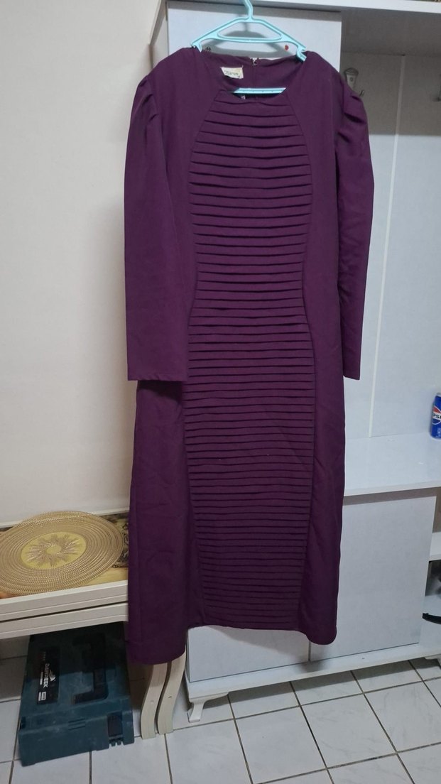 Mor renk, uzun kollu, pilili ön panel ve yuvarlak yaka detaylarına sahip uzun elbise. Yumuşak sentetik kumaştan üretilmiş, ofis kullanımı için uygun, düzenli kesim.