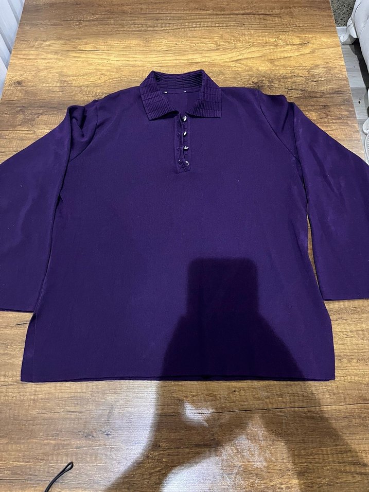 Mor renkli, düğmeli yakalı, uzun kollu polo tişörtü. Rahat kesim ve normal boyda, yumuşak ve sıcak kumaştan, günlük sokak stiline uygun.