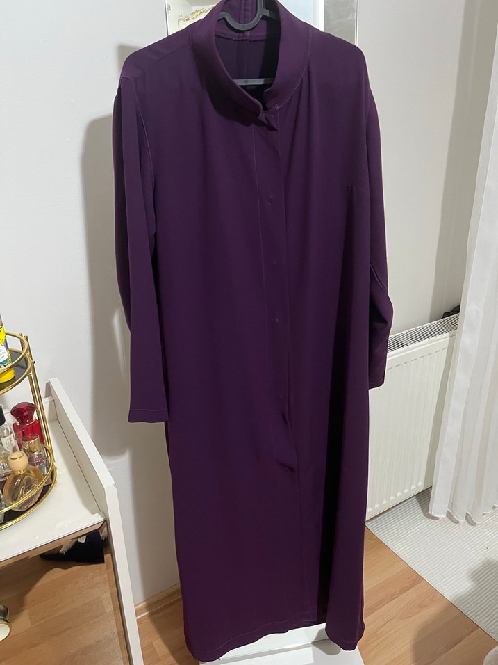 Uzun, rahat kesim kadın elbisesi, uzun kollu ve minimal tasarıma sahip koyu mor renkte. Desensiz, normcore tarzıyla uyumlu.