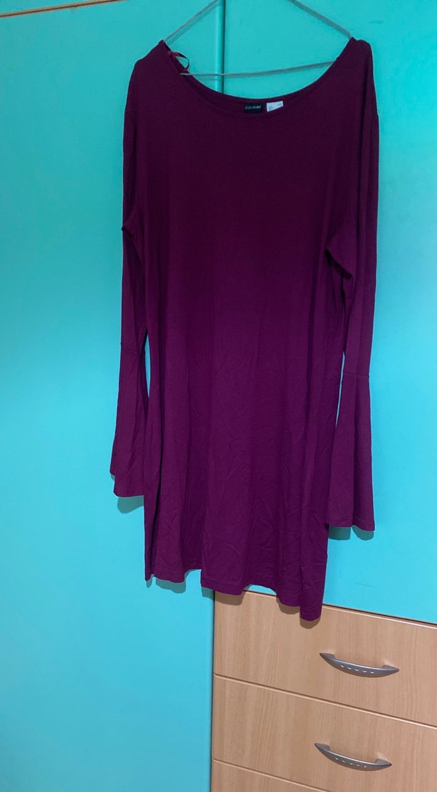 Kadınlar için uzun kollu, salaş kesim, drapeli mor midi tunik. Yuvarlak yakalı, düz ve minimalist tarzda, günlük kullanım için uygundur.