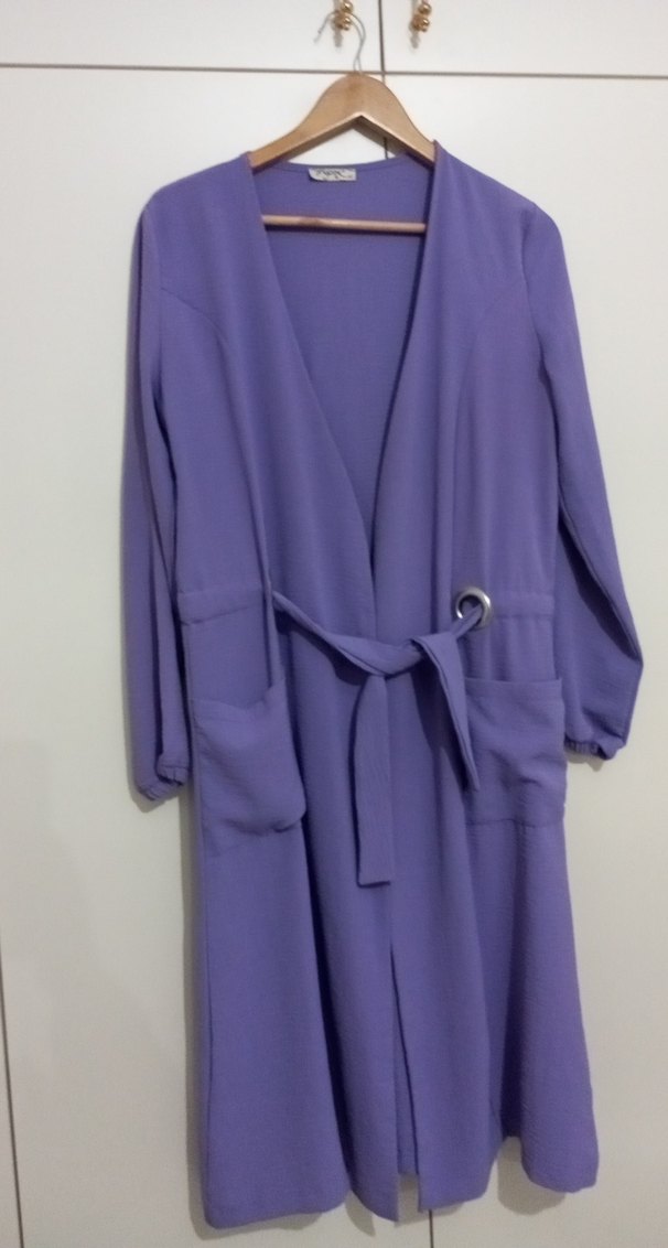 Kadınlar için uzun kollu, salaş kesim ve uzun boyda pastel mor renkte yelek. Minimalist ve normcore tarzda, kemer ve cepler bulunur.