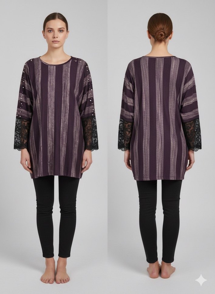 Salaş kesim, uzun kollu, yuvarlak yakalı mor tunik. Kollarında dantel detaylar ve drapeli tasarım bulunur. Günlük kullanıma uygundur.