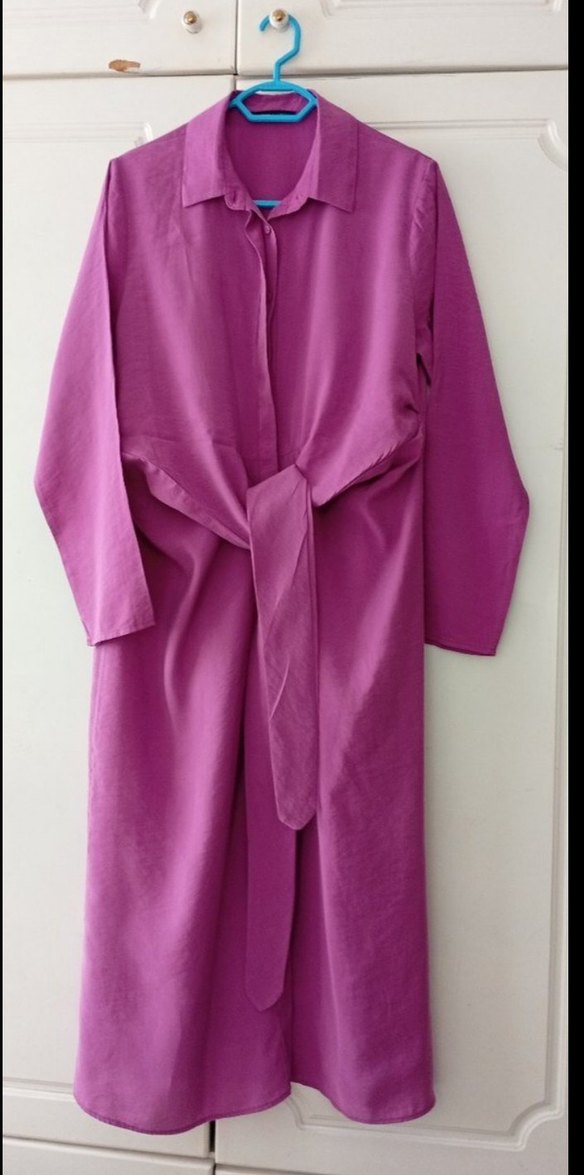 Kadınlar için pastel mor renkte, uzun kollu, salaş kesim uzun elbise. tunik olarakta kullanilabilir Minimalist ve desensiz tasarıma, bel bağlama detayı eşlik eder.