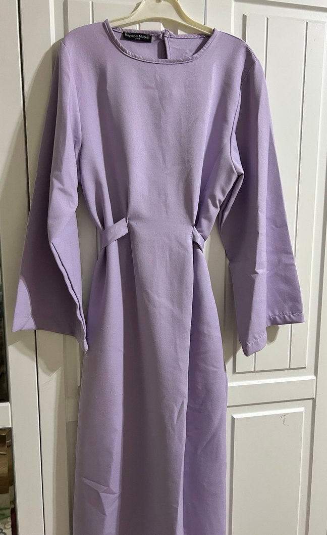 Drapeli, regular fit uzun kollu kadın elbise. İpek dokulu kumaştan, yuvarlak yakalı ve pastel mor renkte, ofis için uygun sade tasarım.