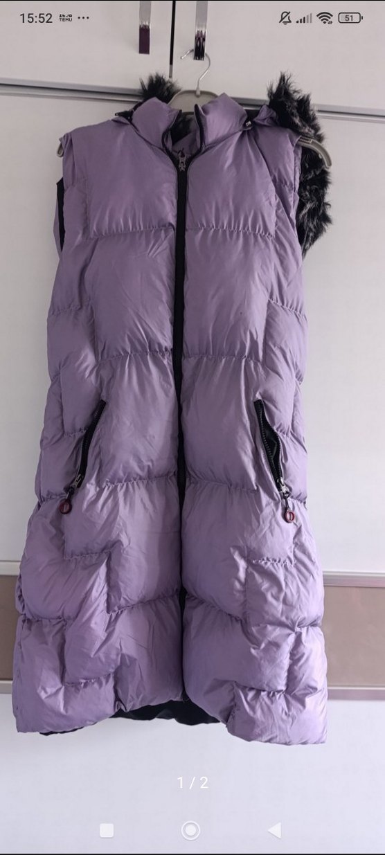 Kadınlar için yüksek yakalı, uzun ve kolsuz mor yelek. Yumuşak sentetik kumaştan, kürk detaylı, fermuarlı ceplidir. Sokak modasına uygun rahat kesim.