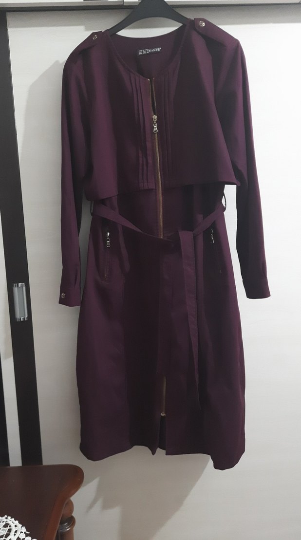 Kadın mor uzun trençkot, kuşaklı ve kesik yaka detaylıdır. regular fit ve uzun kolludur. Minimalist, sokak stili için uygundur. iki koltuk arası 50cm boy 110cm dir.38 44 bedenler arası uygundur