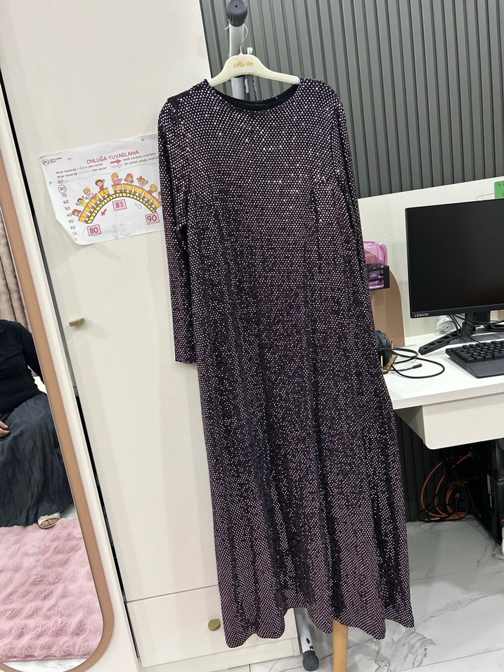 Uzun, bol kesim mor payetli abiye elbise, baskılı desen, uzun kollu ve yuvarlak yaka, göz alıcı partiler için uygun. ✨