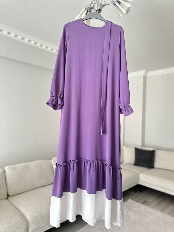 Mor tonlarında, uzun ve bol kesimli, fırfırlı detaylı elbise. Yuvarlak yaka ve uzun kollu, pastel renk geçişli sade tasarım.170 tam boy oluyor
