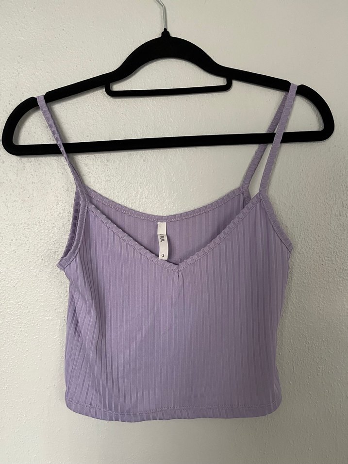 Mor renkli, keten kumaştan, V yaka ve ince askılı, pilili dokulu, normal midi uzunlukta, günlük kullanıma uygun kadın crop.