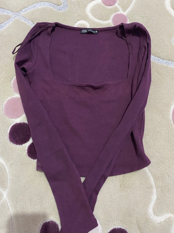 Mor renkte, uzun kollu ve V yakalı, dar kesim kadın bluz. Yumuşak sentetik kumaştan yapılmış, rahat ve şık bir günlük kombin parçası.