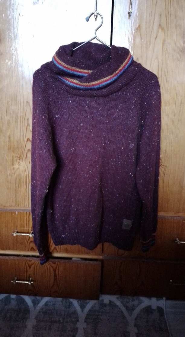 Mor renkte, yüksek yakalı, uzun kollu ve bol kesim örgü kazak. Bohem tarzda, sade tasarıma sahip, yakada çizgili detaylar bulunur.