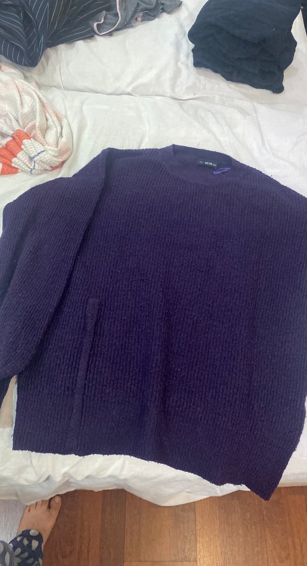 Kadın mor yün triko kazak, yuvarlak yaka ve uzun kollu. Rahat kesimiyle sade ve koyu renkte, günlük kullanıma uygun.