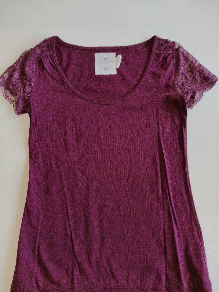 Bordo renkli, kısa kollu ve dantelli detaylara sahip, kadın için triko kumaştan yapılmış, dar kesim tişört.