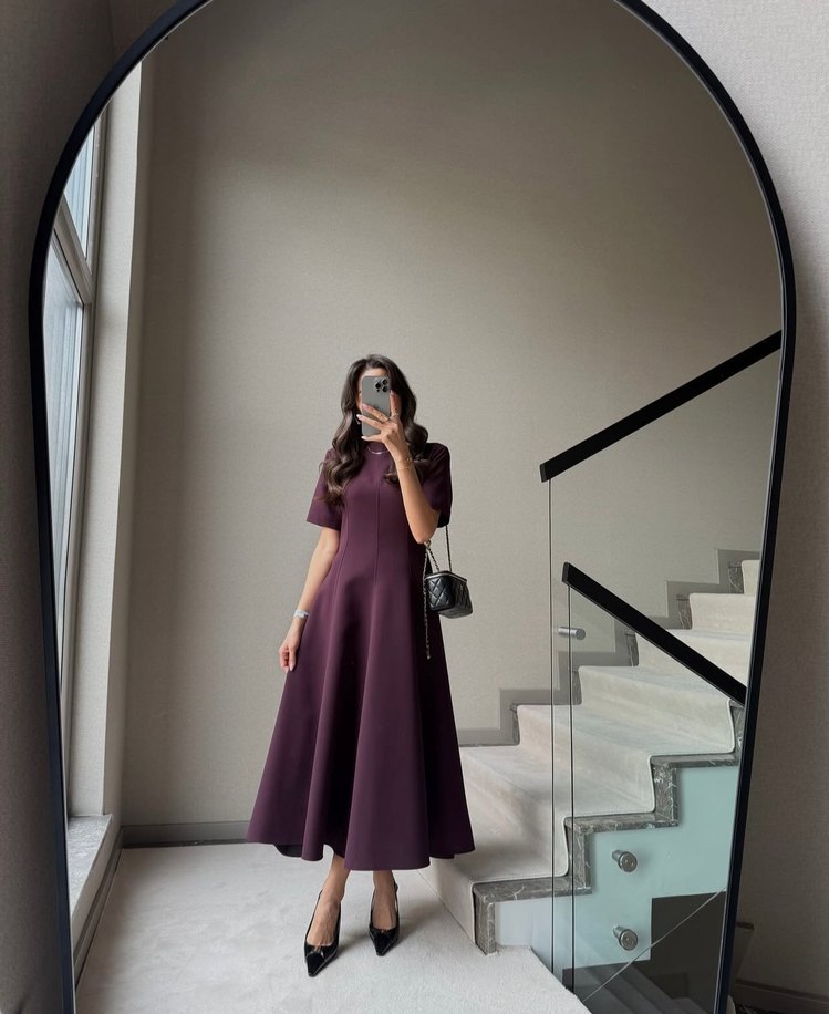 Mor renkli, yüksek yakalı ve kısa kollu uzun elbise. Rahat, dökümlü kesimiyle minimal ve şık bir görünüme sahiptir, günlük kullanıma uygundur. Zara modeldir