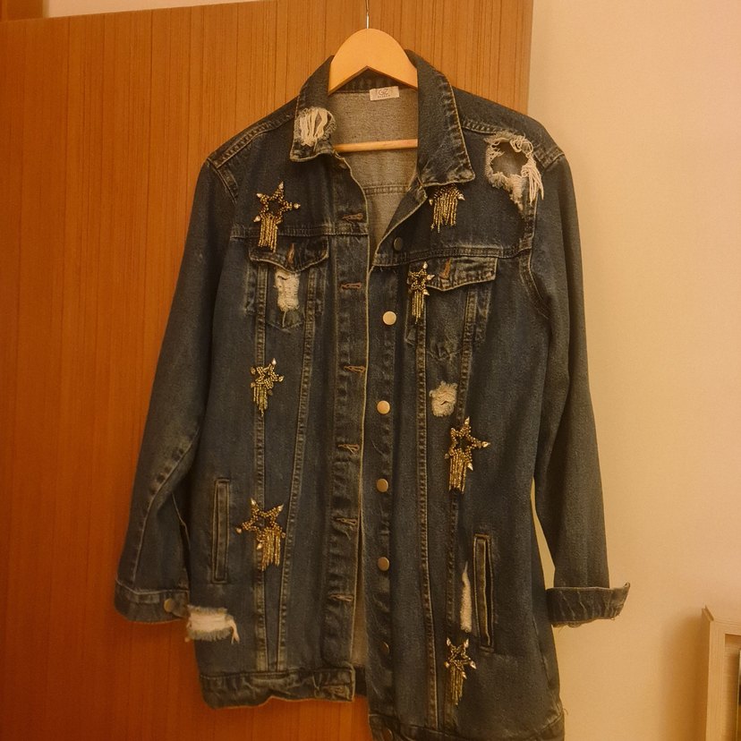 Düğmeli, nakışlı altın yıldız detaylı bol kesim kot ceket. Notlu yaka, askılı kollar ve midi boy ile bohem ve grunge punk tarzlarını yansıtır.✨