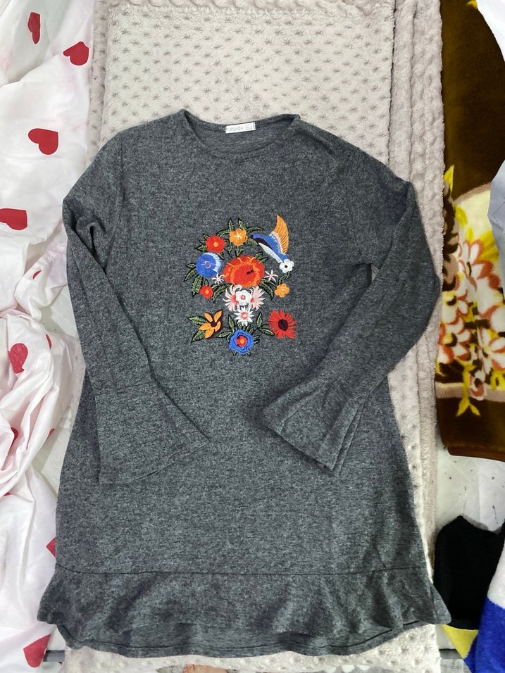 Kız çocukları için uzun kollu, bol kesim gri triko elbise. Önünde renkli çiçek nakışları ve fırfırlı etek ucu bulunur. Bohem tarzda rahat bir modeldir.