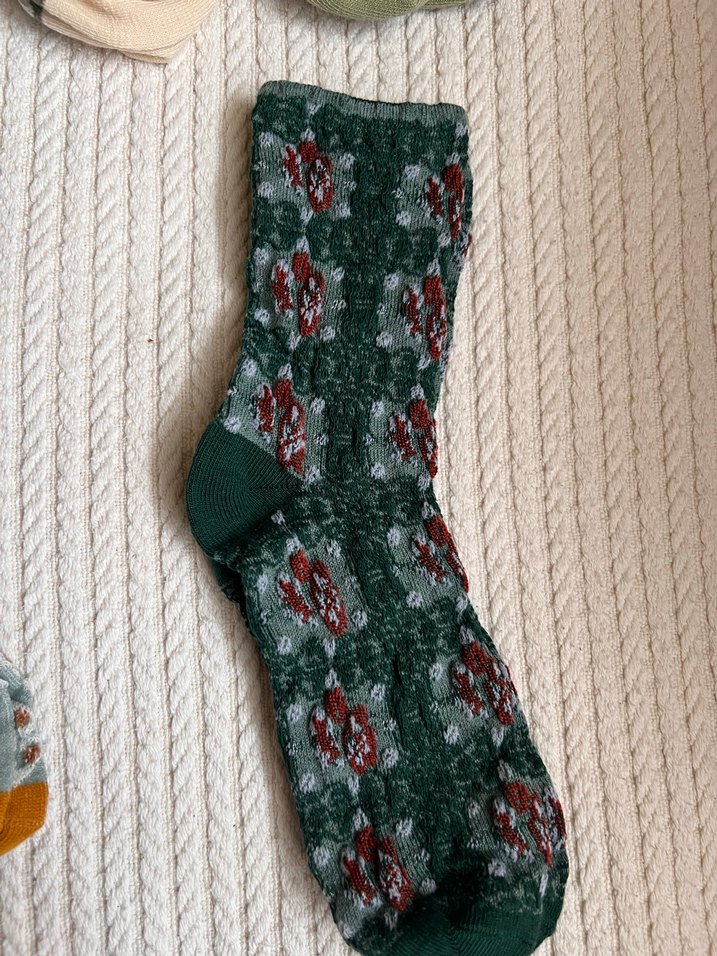 Koyu yeşil renkli, nakışlı çiçek desenli kadın triko çorabı. Yumuşak ve rahat yapıda.
