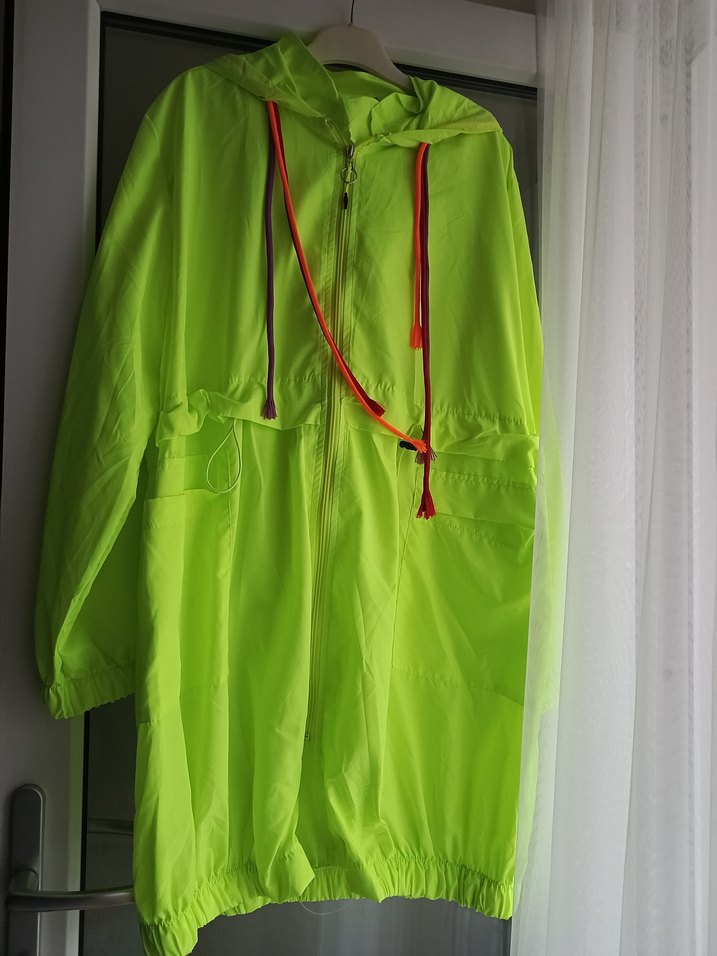 Kadınlar için uzun, kapüşonlu ve fermuarlı neon yeşil yağmurluk. Sentetik kumaştan, bol kesim ve günlük kullanım için uygun. ️