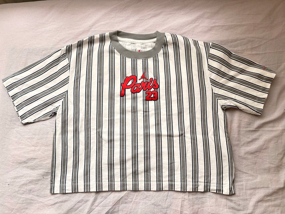 Kız çocuk kısa kollu, bol kesim, bisiklet yaka tişört. Yumuşak pamuktan, dikey çizgili ve "Paris 23" baskılı, pile detaylıdır. S beden