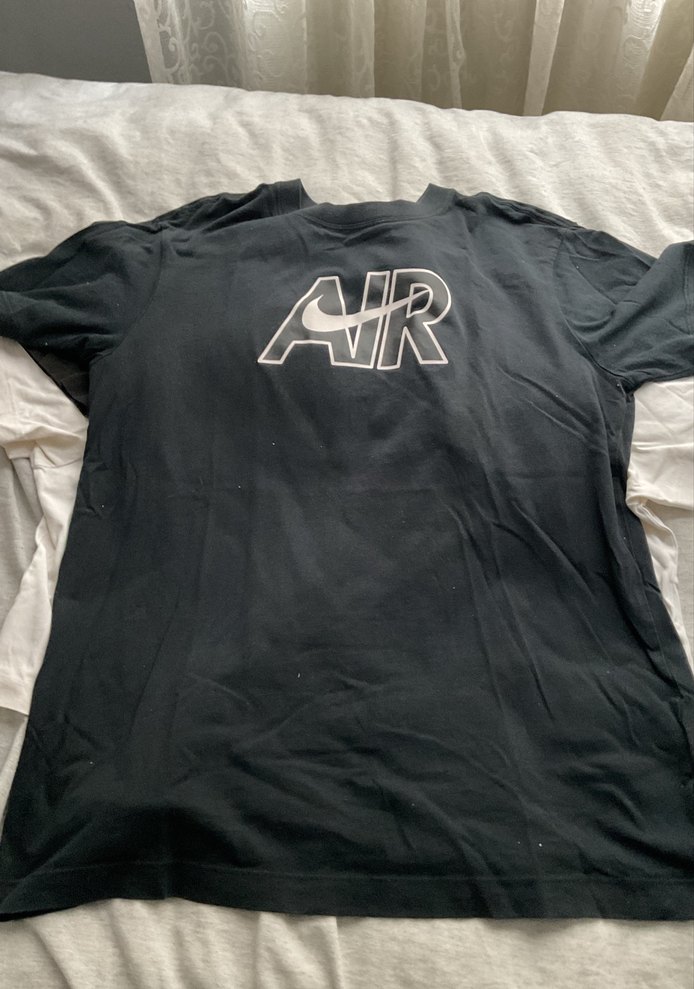 Siyah erkek kısa kollu tişört, yuvarlak yaka ve bol kesimlidir. Önünde "AIR" baskısı vardır, sentetik kumaştan üretilmiştir ve günlük kullanım için uygundur.