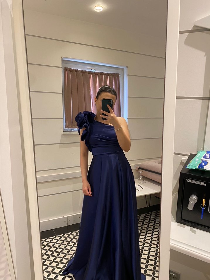 Bir kere giyildi. tek omuz, yan fermuar kapamalı, kolu volanlı, yırtmaç detaylı, abiye. 38 beden.