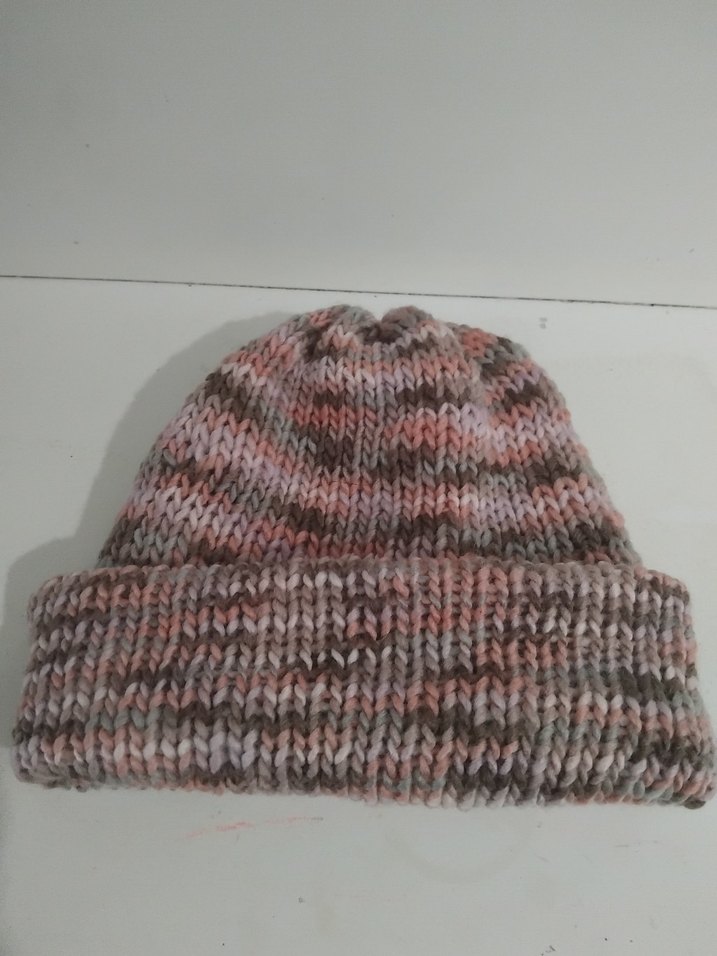 Bej ve gri tonlarda, yumuşak örgü ipten yapılmış, rahat kesimli kadın örgü bere şapka.