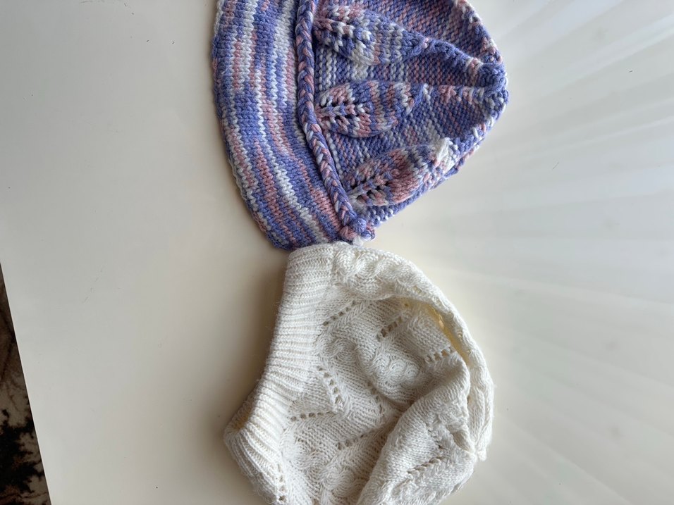 Fiyat sorun lütfen !!Pastel mi mor ile beyaz renkte, bohem tarzda iki örgü kadın bere. Rahat ve dokulu örgü deseni bulunur. ❄️