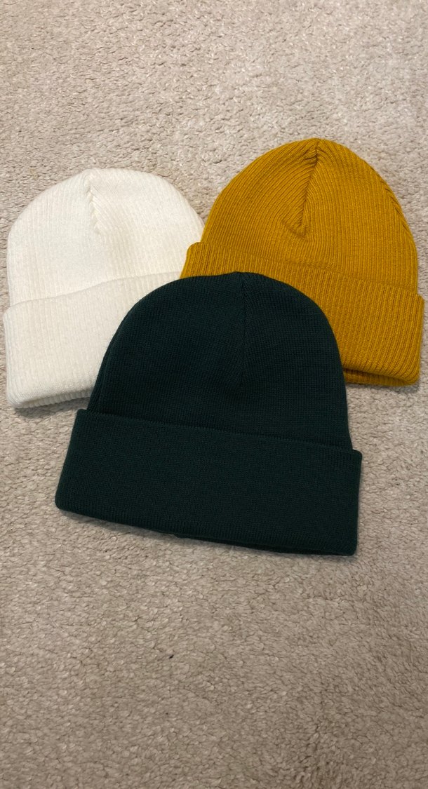 Beyaz, hardal sarısı ve koyu yeşil renklerde örme kumaş, basic sokak stili için uygun üçlü bere seti. Hiçbir kusuru yoktur. Kullanmadığım için satıyorum. Tümü tek fiyat.