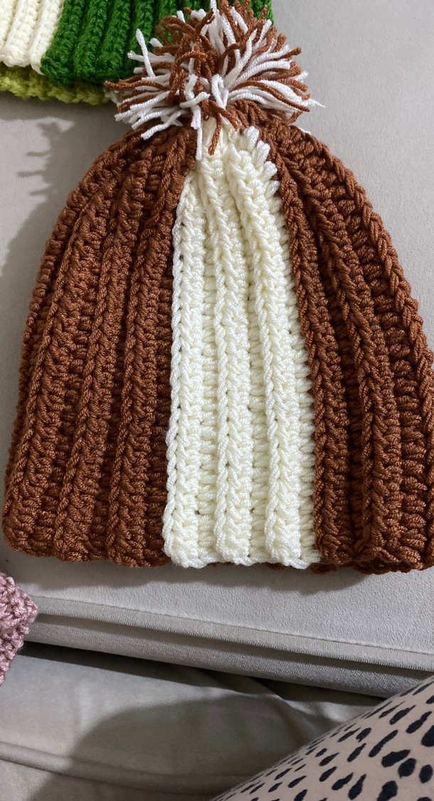Kadınlar için örgüden yapılmış, bej ve kahverengi tonlarında sıcak ve rahat bir bohem bere. Yumuşak dokulu örgü kumaştan üretilmiştir.