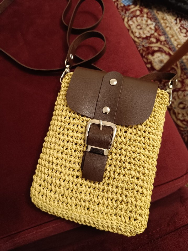 Kadınlar için örgü malzemeden yapılmış, kahverengi kemerli kapaklı, renkli ve rahat bohem tarzda çapraz çanta. hasır rengi natural..