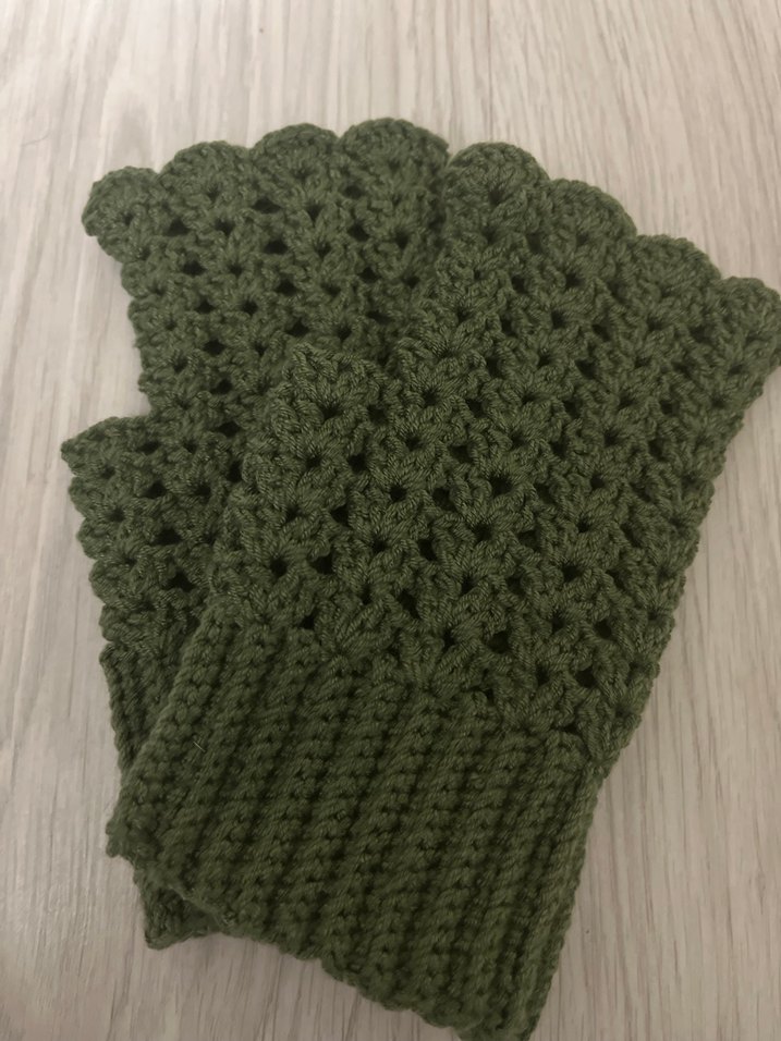 Kadınlar için bohem tarzda, koyu haki renkte örgü eldivenler. Dokulu örgü deseni ve rahat oturan manşet içerir.