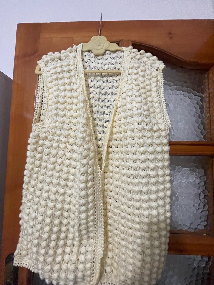 Kolsuz, örgü dokulu, yuvarlak yakalı ve normal kesim kadın yeleği. Pastel beyaz renkli, bohem tarzda, günlük kullanıma uygun. Ürün çeyizlik hiç kullanılmadı